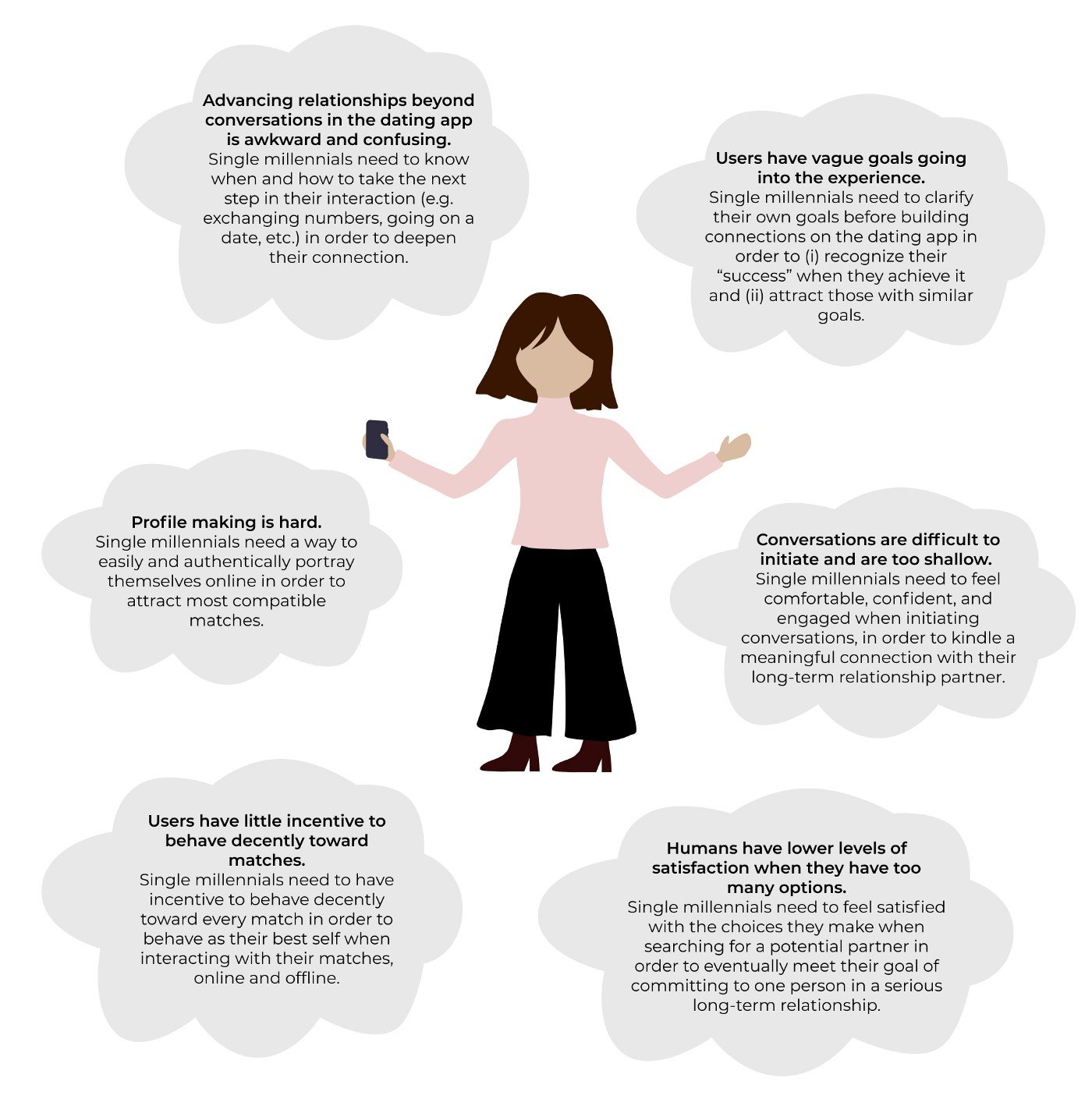 Dating apps aren’t designed to promote positive dating behaviors — as a result, users are having a hard time creating meaningful relationships on their own and can develop unhealthy dating practices. This further obscures the users ability to understand themselves and their intentions through dating.