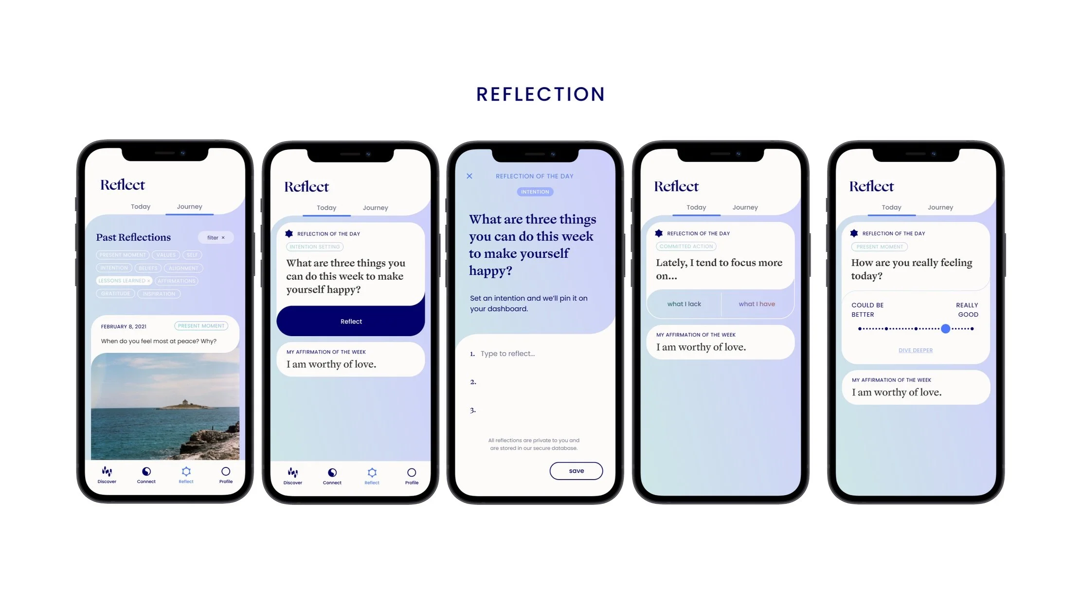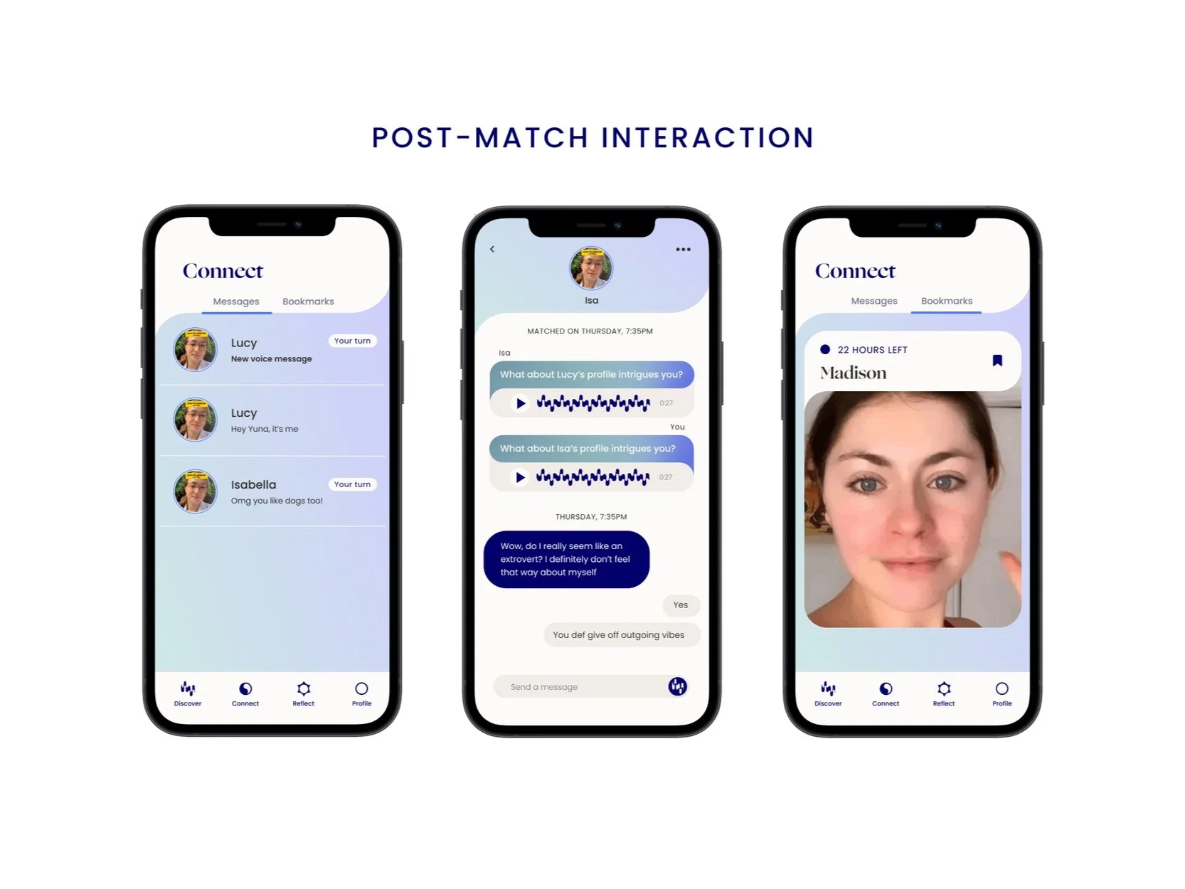 Reflection aims to help people gain self-awareness and confidence. Users get a daily reflection with various response options, which opens the door for varying levels of effort and comfort with looking inwards — lowering the barrier to entry for regular reflection.I worked on the concept and UX flow for matching.